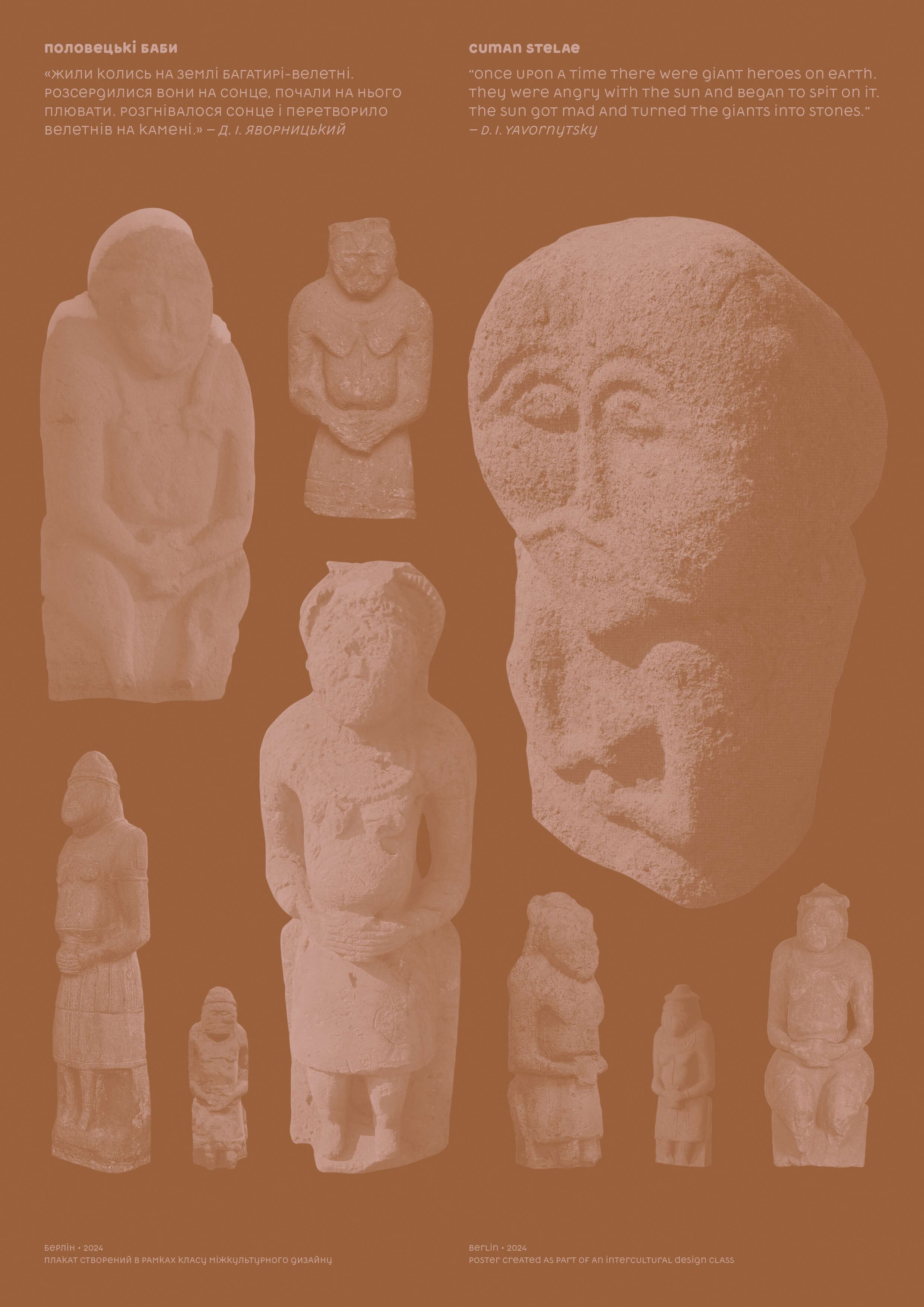 As part of an Intercultural Design Class we explored different ways of connecting to one's roots through print. The poster features Cuman statues that are scattered throughout my mom's hometown – Dnipro, Ukraine.