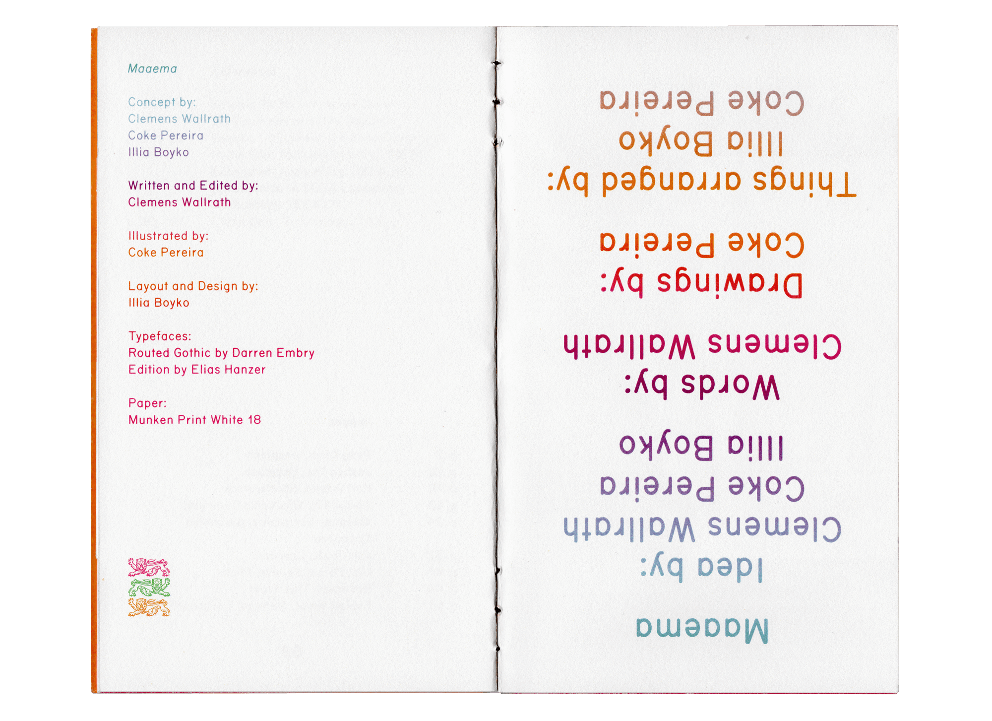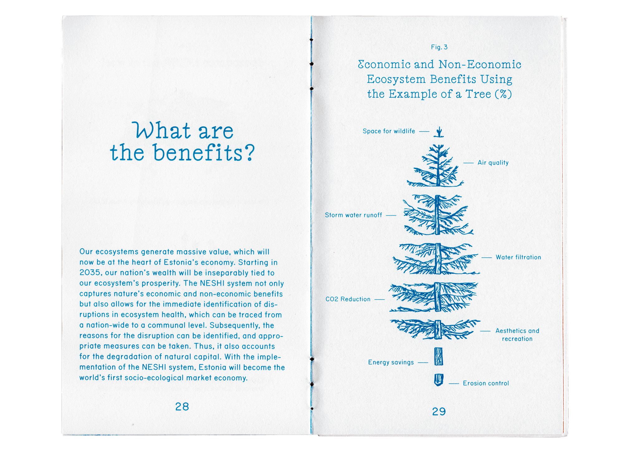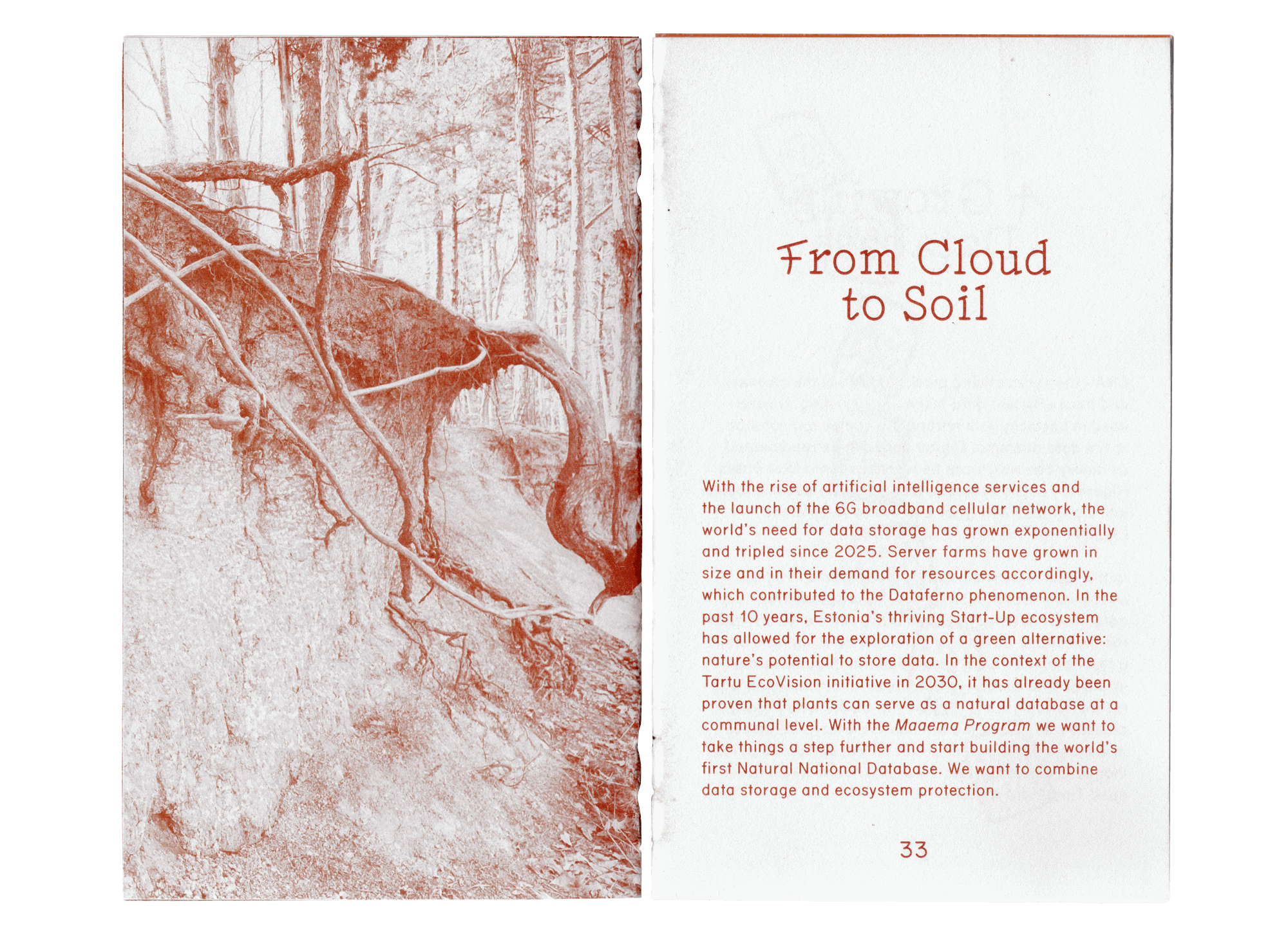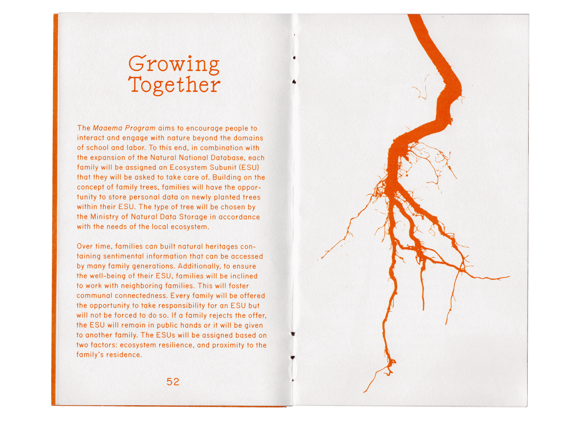 Maaema is a speculative design project that explores a near-future scenario where Estonia reorganizes the state into an ecology-oriented system. The double-sided book is meant to teach and explain the changes to adults and kids alike.