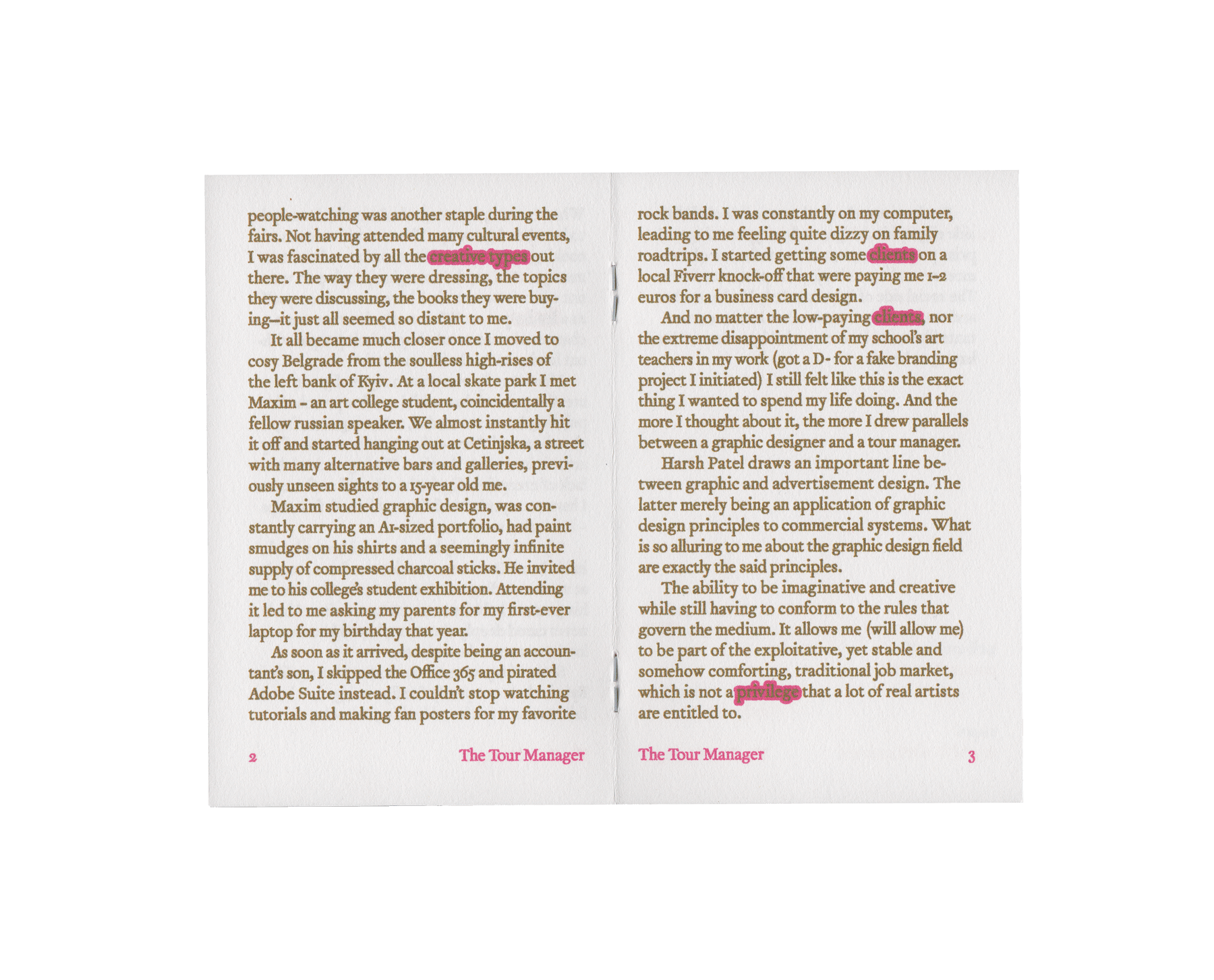 A short run of self-produced zines featuring an introspective essay on graphic design and childhood dreams of one day becoming artist-adjacent. Distributed to friends and family.