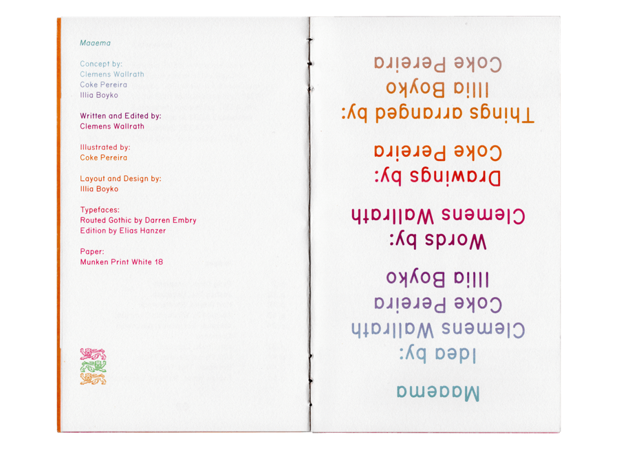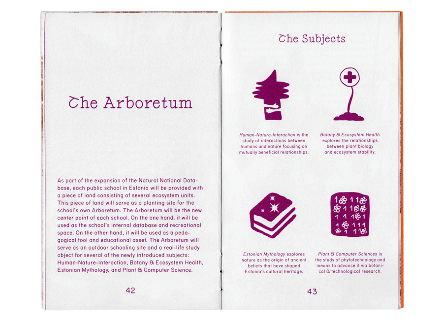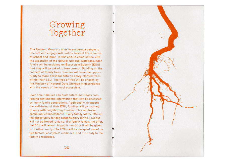 Maaema is a speculative design project that explores a near-future scenario where Estonia reorganizes the state into an ecology-oriented system. The double-sided book is meant to teach and explain the changes to adults and kids alike.