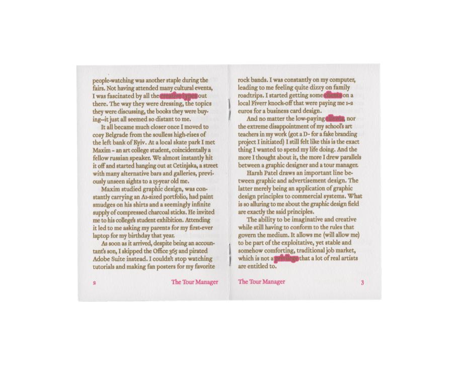 A short run of self-produced zines featuring an introspective essay on graphic design and childhood dreams of one day becoming artist-adjacent. Distributed to friends and family.